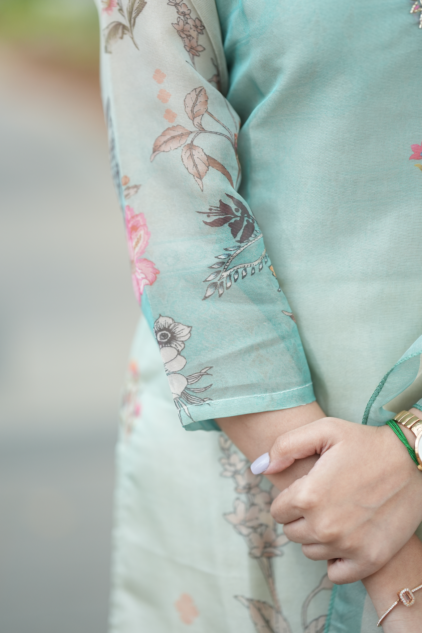 The neckline is the highlight of this piece, adorned with handwork that could include fine embroidery, beadwork, or delicate thread detailing, adding an artisanal touch. The intricate design draws attention to the neckline, enhancing the overall beauty of the outfit with a touch of traditional craftsmanship.