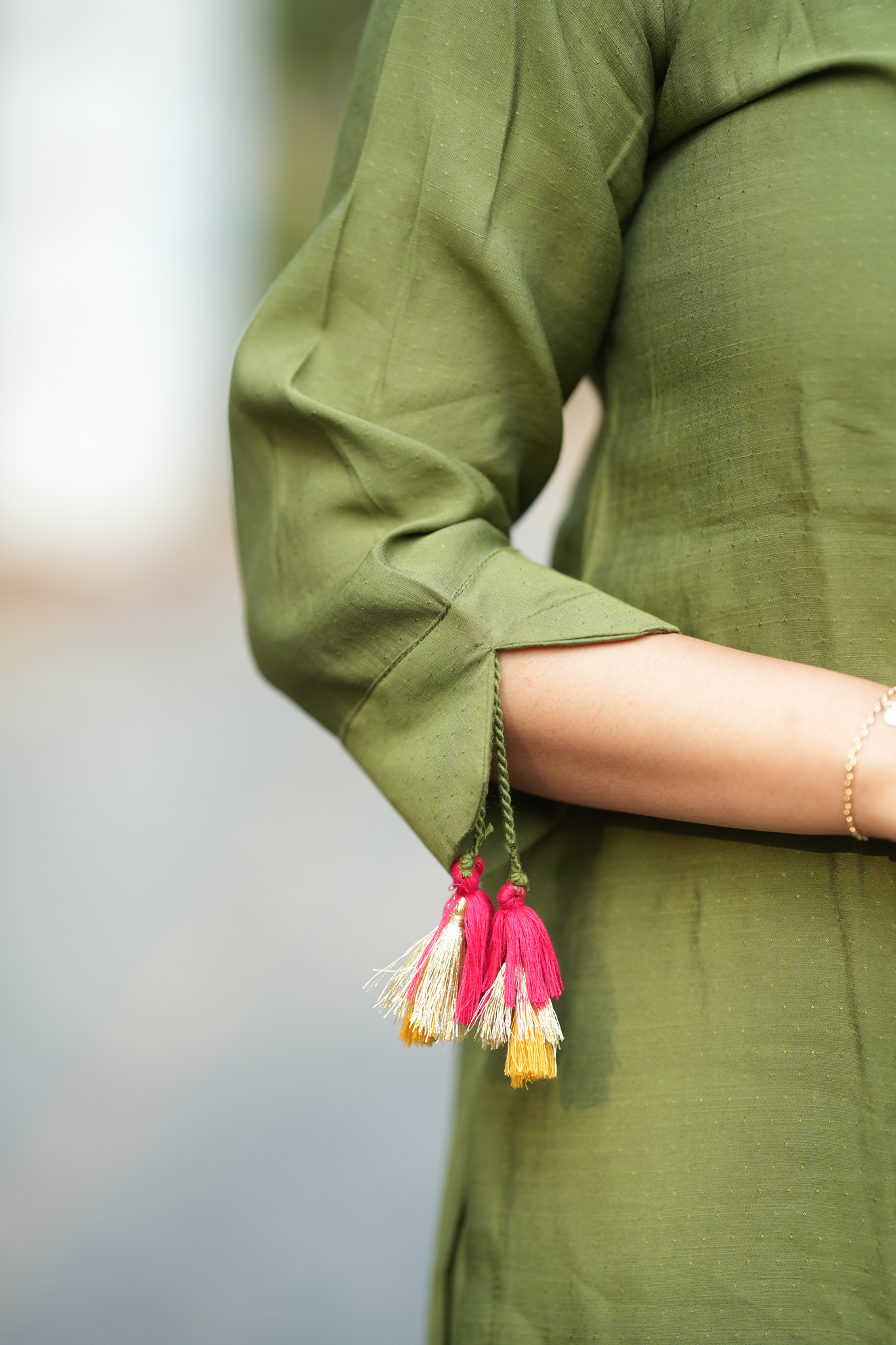 The salwar complements the kurta with a flowing, comfortable fit that allows for easy movement. The silk slub fabric offers a perfect balance of elegance and comfort, providing a flattering silhouette while ensuring breathability and comfort throughout the day.