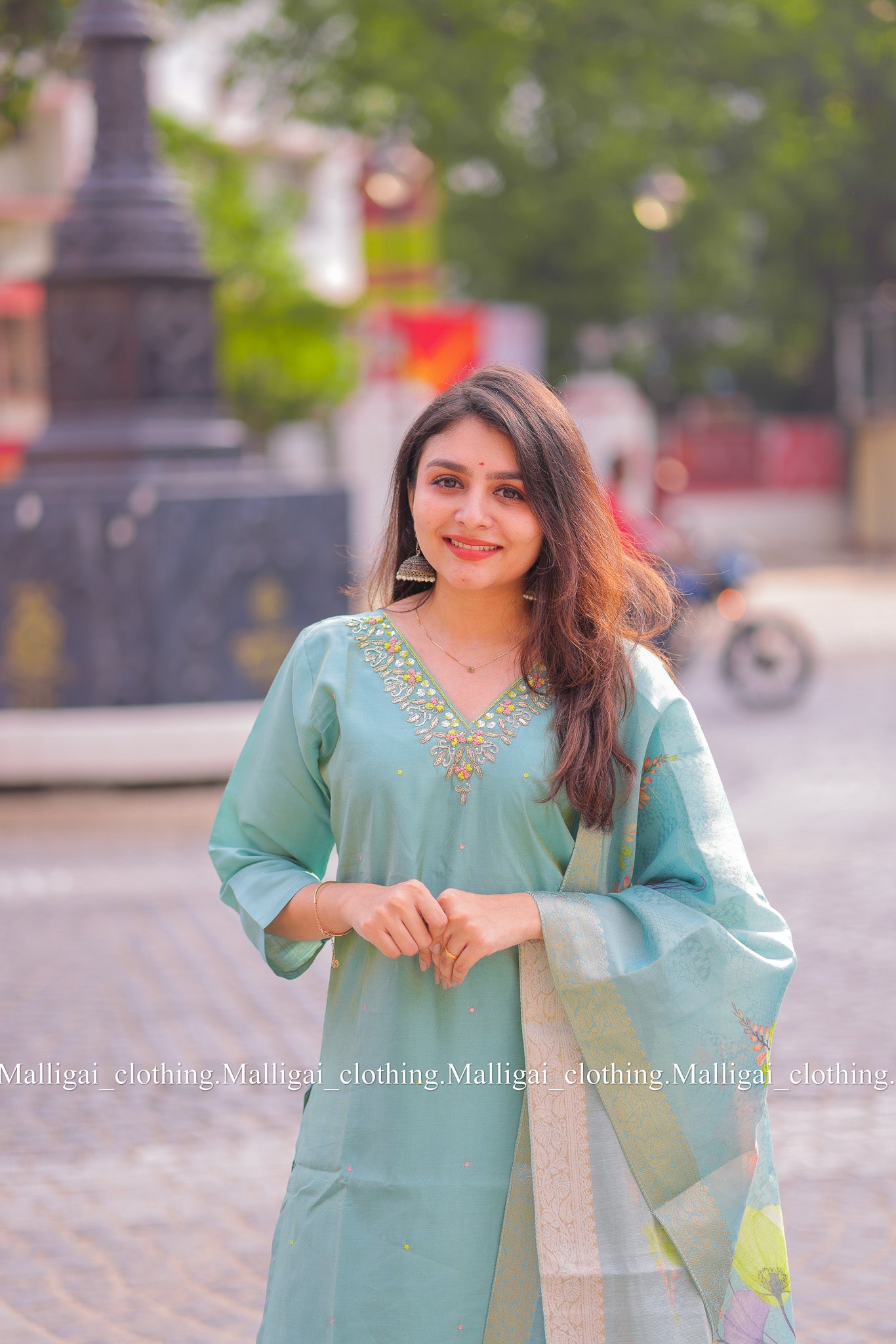 Our Roman silk in a dreamy light blue shade, detailed with beautiful handwork on the neck, is here to steal the spotlight.